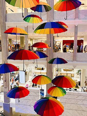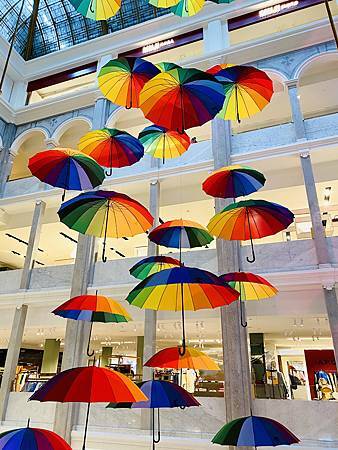 Beautiful rainbow umbrellas’ decoration inside a department store in Copenhagen city center.