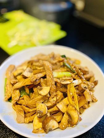 第二道家常菜是以前在台灣時 Danielson 自己很喜歡吃的榨菜肉絲,先將肉絲用蒜末,鹽巴,醬油和太白粉一起攪拌均勻後置入冰箱醃個三小時左右,拿出之前台灣朋友從台灣帶過來的淡榨菜切絲,以前都是這樣炒而已,但這次加入了磨菇一起料理,感覺比較豐盛有變化一點,榨菜肉絲一定要有點辣才好吃啊,所以切了一根青辣椒下去,最後加入蔥段拌炒即可上桌,這一味真的是百吃不厭,讓我想起以前在台灣常常去小麵攤吃榨菜肉絲麵的學生年代。