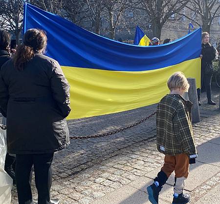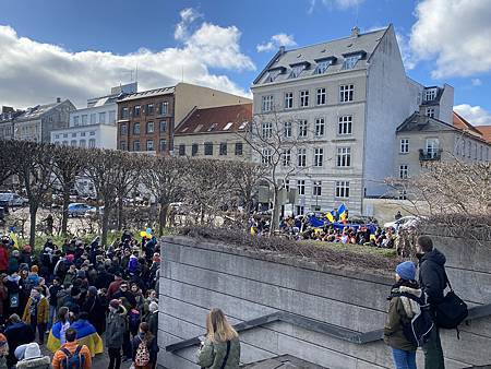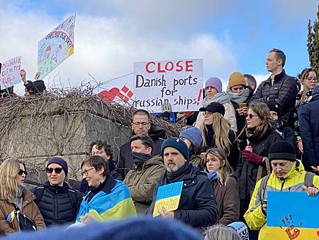 因為是場在哥本哈根當地的支持抗議活動,當然也有本地丹麥人來支持。民眾手持標語寫著 "請關閉所有丹麥港口,不準俄羅斯船隻進入" 來支持烏克蘭,此時 Danielson 有點後悔沒有把家裡的那面台灣大國旗也帶過來。