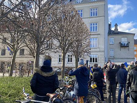 抗議地點選在阿瑪蓮公園裡,而對面就是烏克蘭駐丹麥大使館,大家有看到對面大樓挂著的烏克蘭國旗嗎?