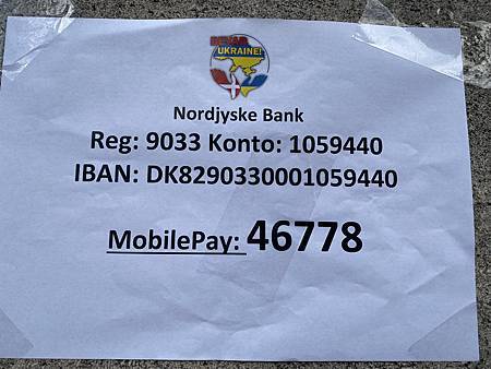 相信大家也都有可以捐款給烏克蘭的資訊,如果有意願的朋友們,上面照片裡有捐款帳號,而最下面的則是給住在丹麥居民,有 MobilePay 的朋友們可以直接用手機捐款的號碼。