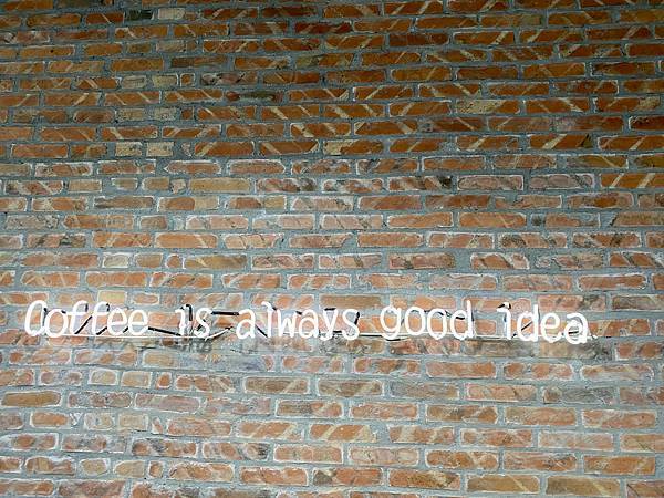 點餐需要自己到櫃檯而且要先結賬,而茶水餐具踩自助式的方式。進門右邊是一面紅磚牆,上面有著 Coffe is always good idea 的字樣燈,還滿有創意的。