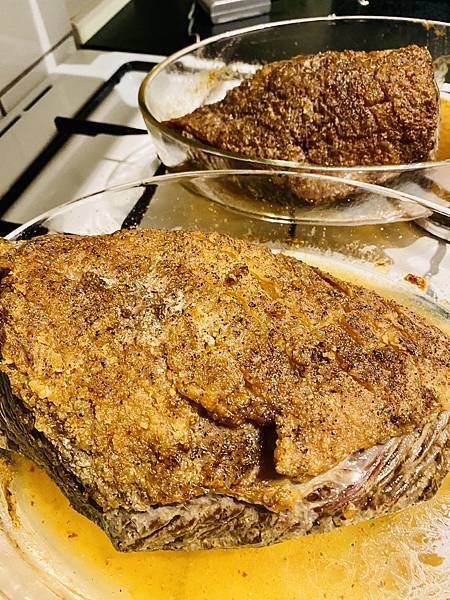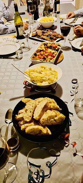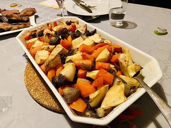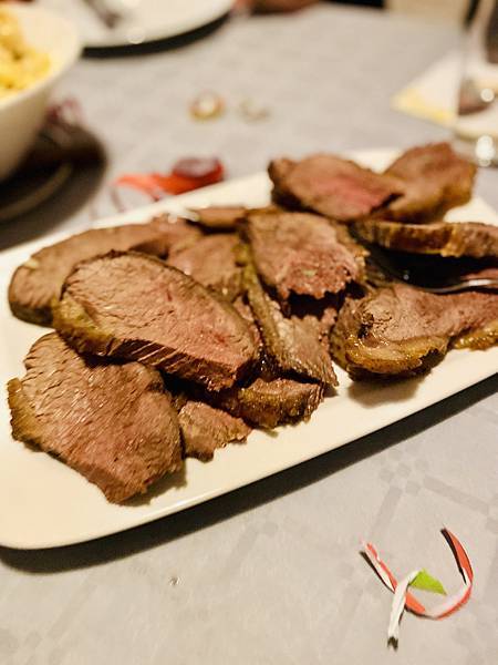 主餐的部份一樣沒有改變,年年同樣的組合,當然西餐裡免不了麵包。蔬菜部份有綜合菜根類組合加上 Creamy potato,以及主角烤牛肉,今年的牛肉烤得很成功,肉質賢能多汁不柴,大家還一起研究半天要怎麼切牛肉才是正確的,看著牛肉的紋路,大家你一言我一語,甚至用了現代高科技的產品詢問了 CHAT GPT 來解答。