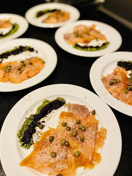 接著Danielson依然負責前菜部份,今年臨時起意,用煙燻鮭魚片佐青醬加魚卵和酸豆,最後淋上青檸汁,原本還擔心煙燻鮭魚會不會有點過鹹,但經過青檸的加持,整個味道中和的剛剛好,也得到大家的青睞,再次成功抓住大家的胃。