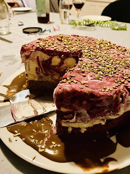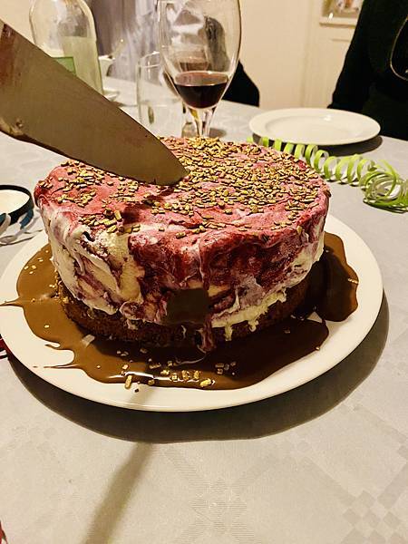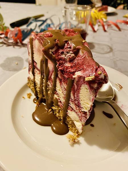 除了 Danielson 的前菜外,甜點的部份一樣依慣例由馬丁先生來準備,他今年端出的是冰淇淋蛋糕,整個感覺就是視覺很加分,淋上他自己親手做的巧克力醬不甜不膩,這甜點也是擄獲了大家的嘴,真的讓大家讚不絕口。