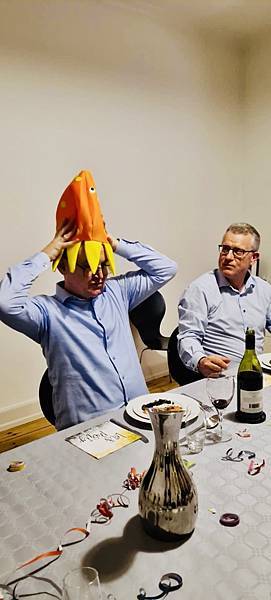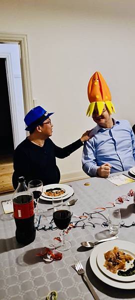 馬丁先生這幾年在新年夜派對上都會帶來有趣的新年小禮來,今年帶了兩頂帽子來,Danielson 的是頂很正常的新年帽,而麥先生的則是跟上最近流行的韓劇魷魚遊戲的魷魚帽,戴在麥先生頭上還一點都不違和很可愛耶。