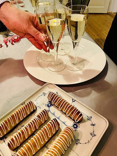 緊接著就是大家舉起香檳杯一起倒數,時間一到大家乾杯互祝新年快樂,吃著丹麥跨年夜一定要吃的傳統餅乾,我自己不是很愛所以今年跳過。然後大家跟著電視上的合唱團一起唱丹麥國歌,迎接 2025 的第一天。